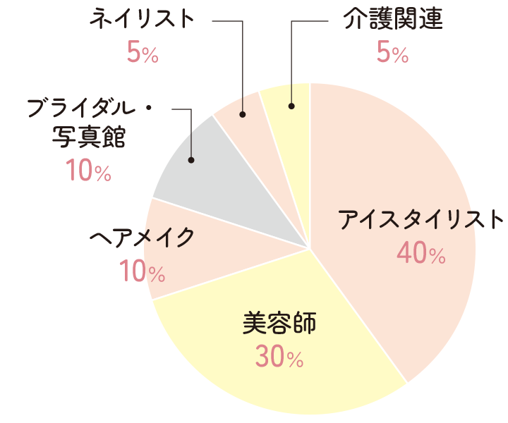 ライセンスコース卒業生は、美容やアイラッシュサロンの就職にとどまらず、ブライダルや高齢者向け美容関連の起業・海外進出・商品開発など、国家資格を活かして独自のライフプランを築く方が多数いらっしゃいます。また、就職活動も、年齢や目的により独自に活動する方が多いため、必要な方には個別サポートをしています。